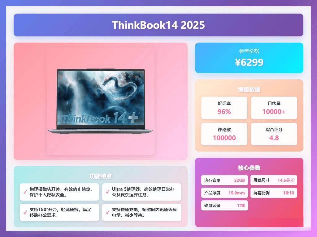点评:ThinkPad ThinkBook 14+配备了英特尔酷睿Ultra 5 225H处理器,运行速度非常快,能够轻松应对日常办公、写作和复杂任务。32GB高速内存让应用切换和多任务处理毫无压力。14.5英寸的3K分辨率和120Hz刷新率让画面细腻流畅,色彩鲜艳,基本满足日常文档和娱乐需求。机身设计轻薄,接口丰富,电池续航也很不错,整体性能和体验都非常均衡。