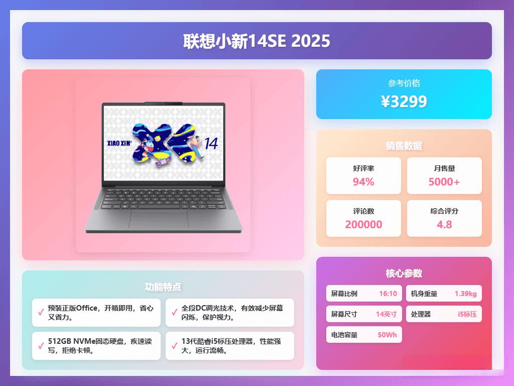 点评:联想IdeaPad 5搭载13代英特尔酷睿i5 H系列处理器,性能表现非常稳定,日常使用、办公和学习都非常顺畅。16GB双通道DDR5内存让多任务处理毫无压力,512GB固态硬盘的存储速度也非常快。整体设计轻巧,适合经常需要外出办公或学习的用户。