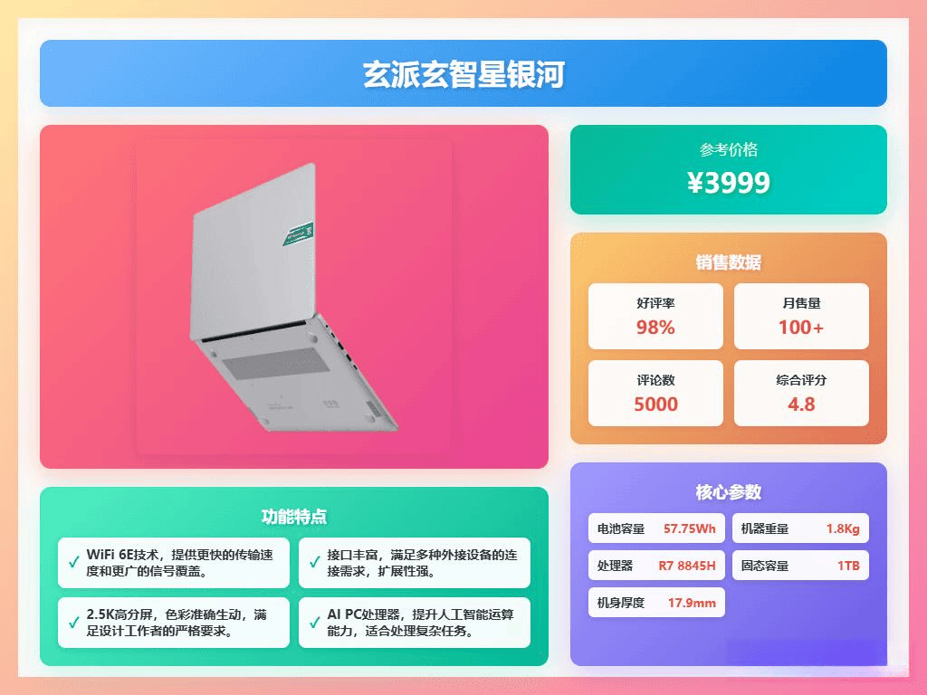 点评:玄派笔记本搭载AMD锐龙7 8845HS处理器,性能强劲,适合处理复杂任务。16英寸2.5K显示屏画面细腻,色彩线Hz刷新率让画面流畅。32GB内存和1TB固态硬盘的组合,存储空间充足,性能稳定,适合日常办公和娱乐使用。